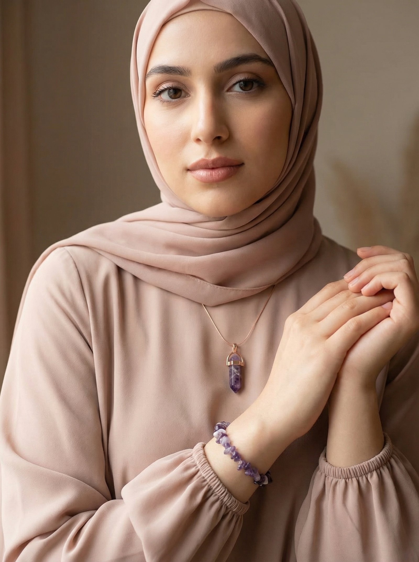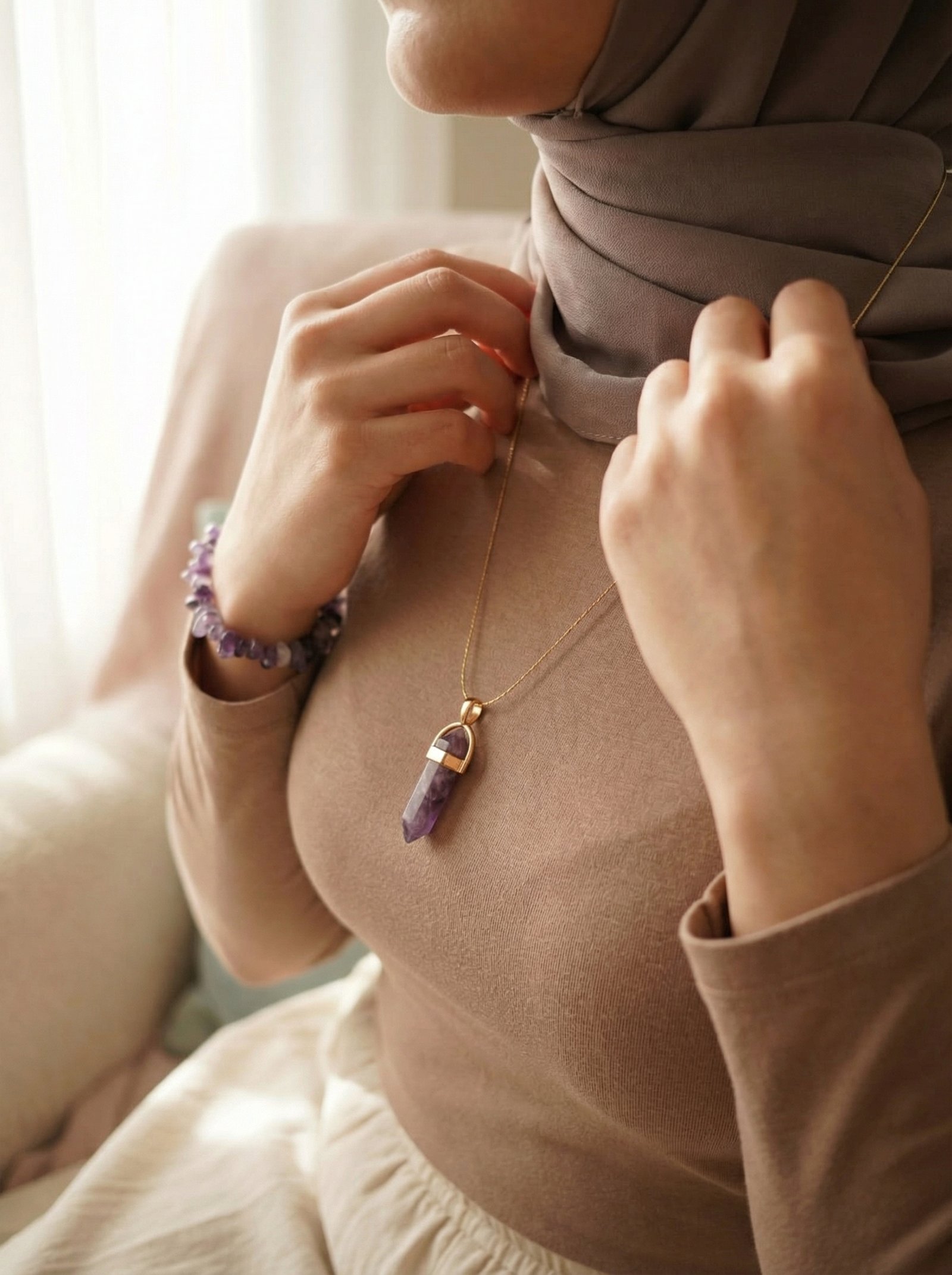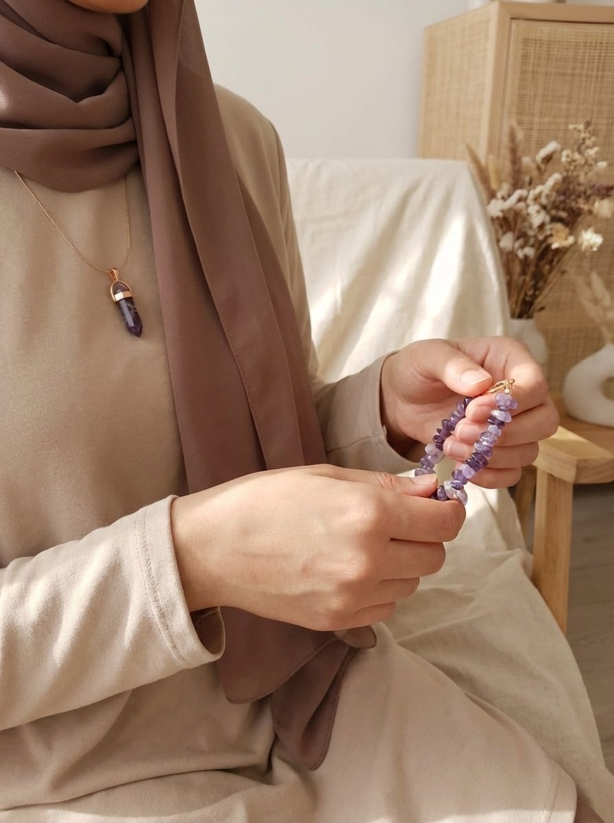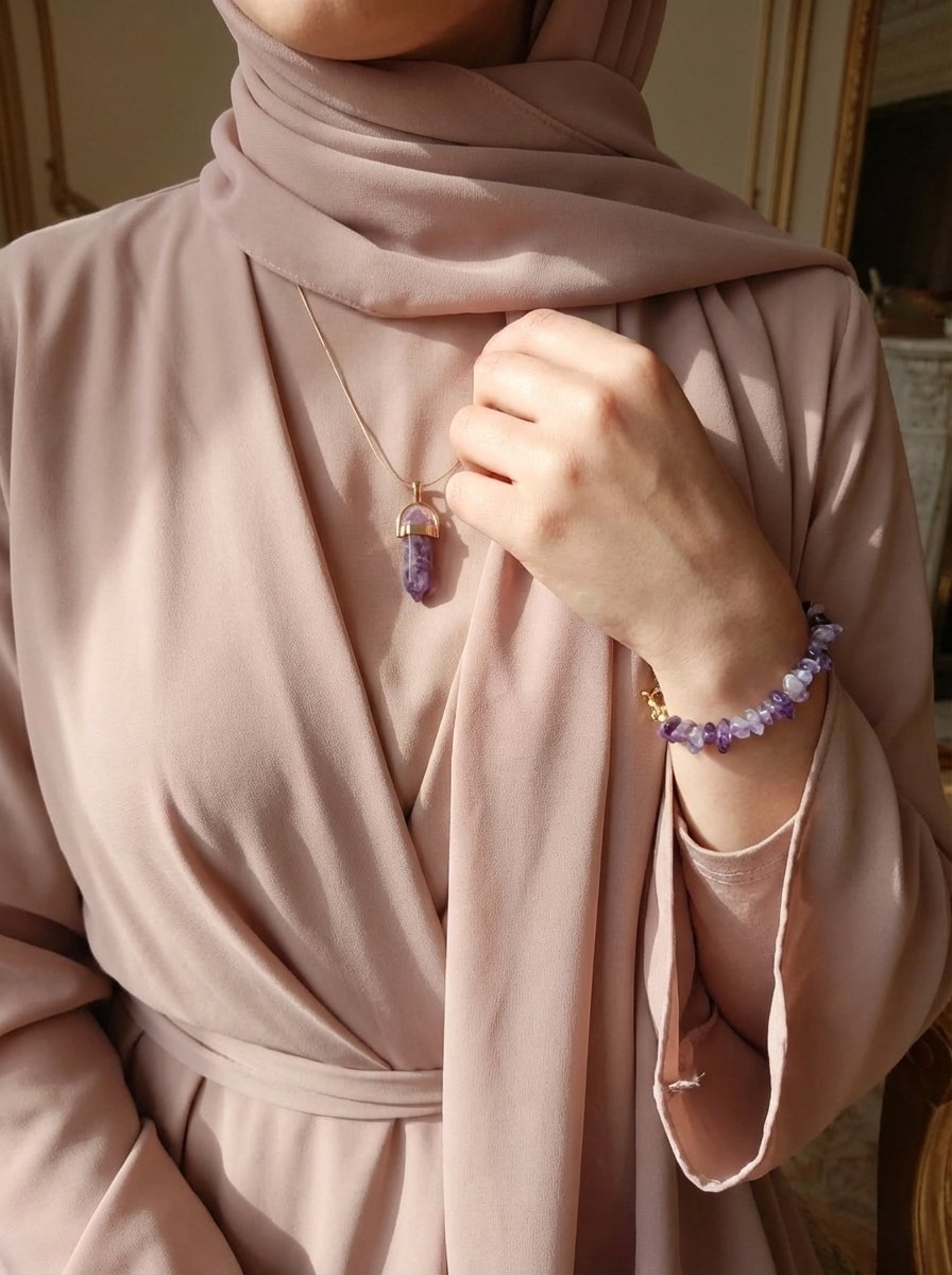 • The Bracelet: A graceful arrangement of polished amethyst beads, offering a comfortable fit and a sophisticated pop of color for any occasion.